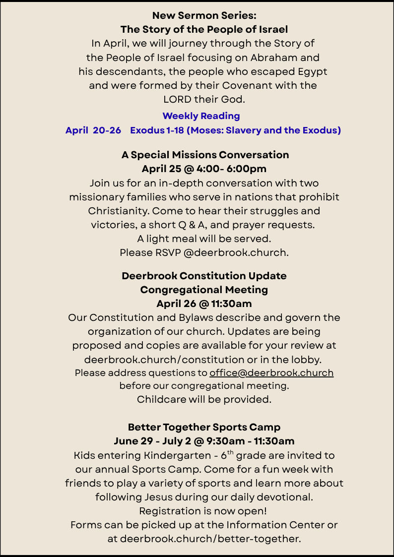 We are starting a new sermon series discussing the Story of the People of Israel. Or you can livestream the service on Facebook or on our YouTube channel.